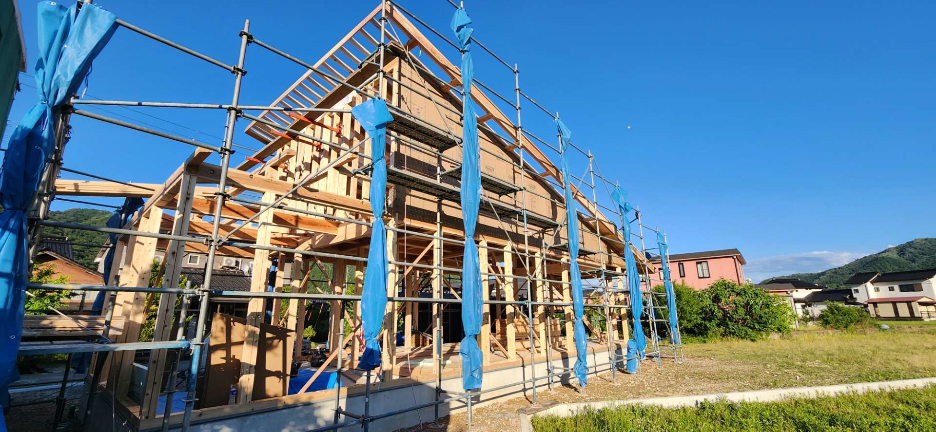 上棟 快晴の青空のもと、上棟を行いました。 雨の心配をせずに作業ができることは何よりの幸せ...